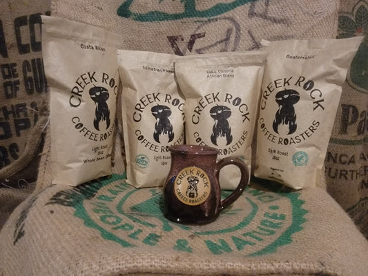At Creek Rock. We pride ourselves in sourcing the finest Organic, Fair-Trade coffees from around the world. We roast our coffee using a hot air or fluid bed method, of roasting the coffee. To just the right temperature. For just the right roast. That captures the essence of the origin, variety and individual farm. We use packaging that is manufactured in the USA and biodegradable. Customers can compost the packaging. The entire package. The label, the gas vent and the zip enclosure.